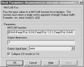 Рис. 1.8. Настройки блока Matlab Fcn, содержащего аналитическое описание элементов матричной весовой функции