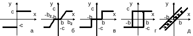 Рис. 1.1. Характеристики нелинейных элементов: а – идеальное двухпозиционное реле; б – усилитель с ограничением и зоной нечувствительности; в-трехпозиционное реле; г – двухпозиционное реле с гистерезисом; д – люфт