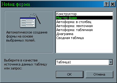 В окне Новая форма выбираем таблицу, по которой будем строить форму и включаем режим Мастер форм.