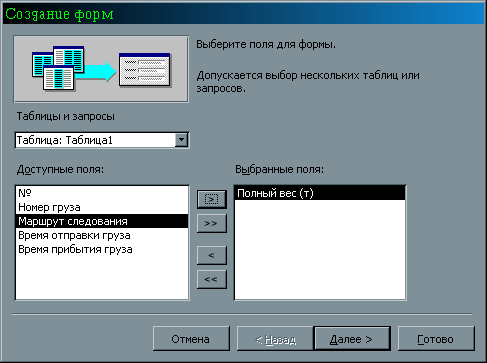 4. Выбираем поле « Полный вес », которое должно быть в нашей форме и нажимаем кнопку Далее.