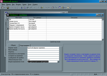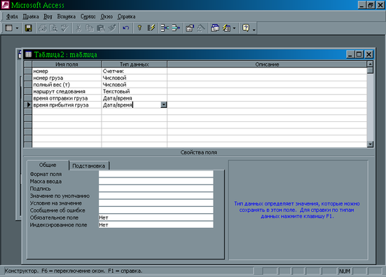 В панели Конструктора таблиц вводим имена новых полей, тип данных, формат поля: