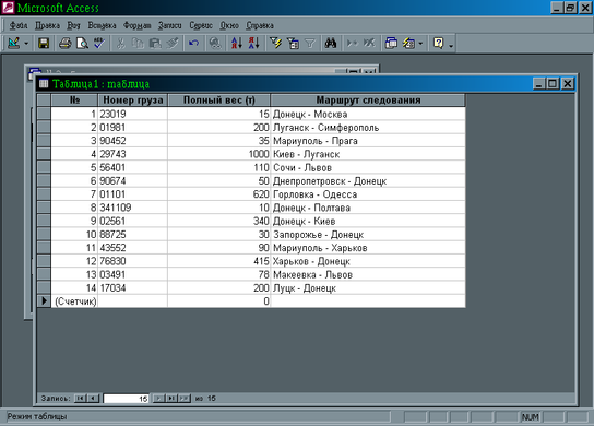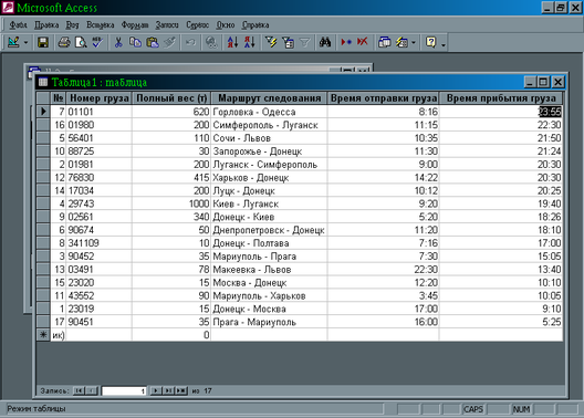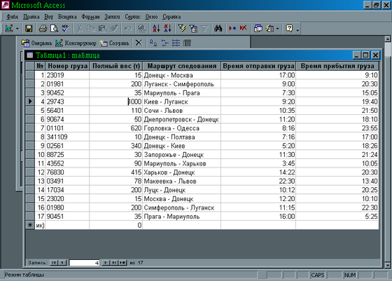 10. После перехода в Режим таблицы вводим записи в созданную таблицу (Рис. 1.7)