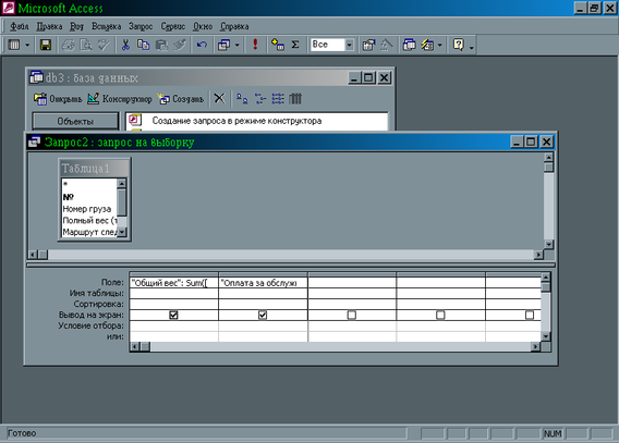 5. В окне Конструктора запросов переносим необходимые поля в строку Поле бланка запроса.
