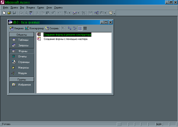 2.В появившемся окне База данных переходим на вкладку Формы, нажимаем на кнопку Создать.
