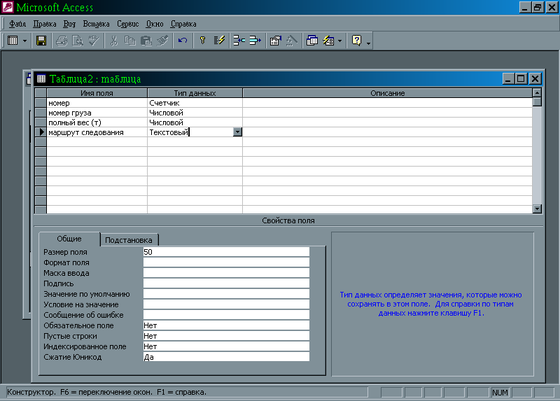 На основе полученной таблицы определяем имена полей, тип данных, размер полей: