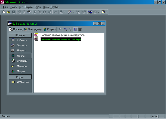 2. В появившемся окне База данных переходим на вкладку Отчет и нажимаем кнопку Создать.