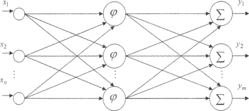 Нейронная сеть радиальных базисных функций содержит в наиболее простой форме три слоя: обычный входной слой, выполняющий распределение данных образца для первого слоя весов; слой скрытых нейронов с радиально симметричной активационной функцией, каждый j -й из которых предназначен для хранения отдельного эталонного вектора в виде вектора весов wj(h); выходной слой