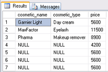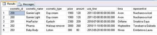 values(200,'Garnier Light','Day cream',1900,120,'3/8/2011','Avon','Nurzhanova Asel')