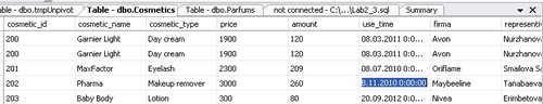 values(203,'Baby Body','Lotion',300,80,'9/20/2012','Nivea','Erimbetova Laura')