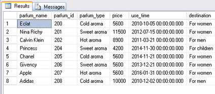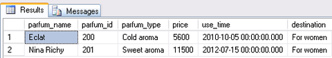 values ('Eclat',100,'Cold aroma',5600,'10/5/2010','For women')