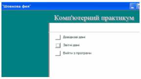 Створюємо головну кнопкову форми, яка повинна містити закладки: Довідкові дані; Вибіркові дані (для аналізу даних на основі запитів) та Звітні дані (для відображення створених звітних документів). Також додаємо до головної кнопкової форми кнопку для переходу між підменю та кнопку закриття форми.