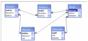 При створенні міжтабличних зв’язків використовуємо команди Сервис – Схема даннях – додаємо всі створені таблиці. Зв’язуємо ключові поля: KodTov(Продукція) – KodTov(Вміст замовлення); KodVur (Виробники) – KodVur(Продукція); KodVur (Виробники) - KodVur (Замовлення); KodPr(Персонал) - KodPr( (Замовлення); NomZam (Замовлення) - NomZam (Вміст замовлення). В діалоговому вікні Связи вказуємо цілісність, каскадне оновлення зв’язаних полів, каскадне видалення зв’язаних записів.