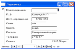 Складна стовпчикова форма для введення, редагування та перегляду даних про працівників створюється на основі таблиці Персонал, з використанням Мастера форм. Отримана форма представлена на Рисунку 4.