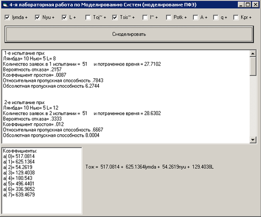 По Таблице 2 и формуле 7 определяются коэффициенты выбранной модели планирования эксперимента аi (i=0.3). Таким образом, зависимость среднего времени ожидания от интенсивности поступления заявок, интенсивности обслуживания и количества мест в очереди примет вид:
