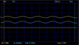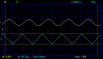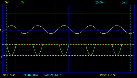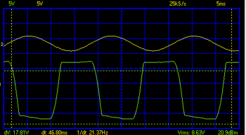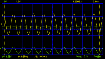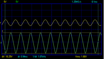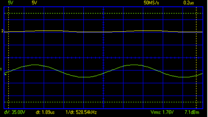 Выходной сигнал имеет синусоидальный вид при Uвх=5В, частоте - 100Hz. При увеличении сопротивления происходит обрезание выходного сигнала сверху. Тоже самое происходит при уменьшении, только обрезание сигнала происходит снизу.