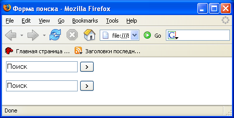 Эта форма передает запрос серверному скрипту search.php. Форма состоит из текстового поля для ввода запроса и кнопки отправки данных на сервер. Фраза «Поиск», вписанная в текстовое поле, задана атрибутом value. С помощью события документа onfocus запускают код на JavaScript. Можно использовать событие onclick, срабатывающее при клике на элементе, но оно менее универсально. В любом случае событие запускает программный код. В этот раз код не вынесен в отдельную функцию, а записан в качестве значения this.value = "" и фактически означает «установить значение текущего (this) поля равным пустоте».