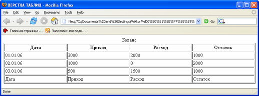и на шапку, нижнюю часть и тело таблицы соответственно. Эти теги должны следовать в указанном порядке. В помещены ячейки с заголовками столбцов, в — основные данные, в продублированы названия столбцов для удобства, если таблица получится большой.Рис.5. Таблица, при верстке которой применены «продвинутые» теги.