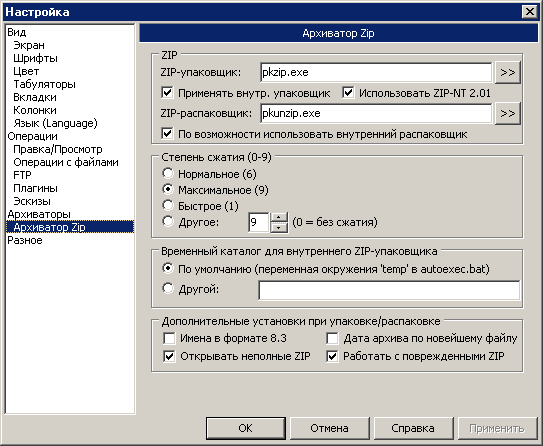 Следует особо обратить внимание на то, что можно управлять степенью сжатия архиватора ZIP. Для этого необходимо нажать на кнопку «Настройка» - «Архиватор ZIP» и указать степень сжатия.