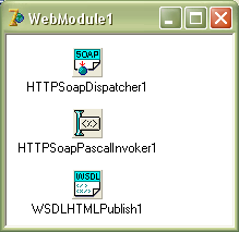 • HTTPSoapDispatcher одержує і обробляє SOAP-повідомлення, перенаправляючи їх invoke інтерфейсам, зареєстрованим у прикладенні. Таким чином HTTPSoapDispatcher є диспетчером, відповідальним за прийом, розподіл і відправку SOAP-повідомлень. Інтерпретація запитів і виклик методів інтерфейсів здійснюється іншим компонентом, вказаним у властивості Dispatcher (HTTPSoapPascalInvoker1).