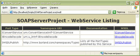 У разі розробки сервера на Delphi існує модуль з описом інтерфейсу сервера на мові Object Pascal, т.ч перший етап може бути пропущений. У випадку якщо сервер був розроблений із використанням інших мов або модуль з описом інтерфейсу недоступний, необхідно одержати опис інтерфейсу у форматі WSDL або XML. Перший варіант – це попросити файл з описом у розроблювача, другий - згенерувати опис самому. Для цього досить запустити Web-браузер і в рядку адреси набрати команду: http://///wsdl. У даному прикладі сервер розташовано на локальному комп’ютері, як Web-сервер IIS, тому рядок адреси виглядає так: http://localhost/Scripts/SOAPServerProject.exe/wsdl. При цьому на екран буде виведена таблиця з описом інтерфейсів сервера (мал. 7).