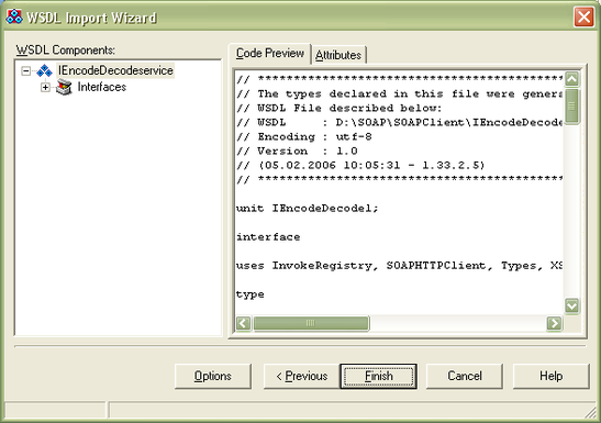 Використовуючи кнопку … діалогу, вкажемо одержаний раніше файл SOAPClient.xml, і натиснемо кнопку Finish. Модуль Delphi з описом інтерфейсу готовий.