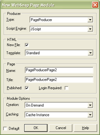 WebSnap-прикладення в реальних проектах містить декілька модулів сторінок. Додамо новий модуль сторінки у прикладення командою File | New | Other | Web Snap | WebSnap Page Module. У діалозі вибору параметрів модуля (мал. 3.11) натиснемо кнопку ОК, - одержимо модуль сторінки з ім'ям PageProducerPage2 (мал. 3.12).