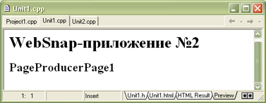 Друга закладка Unit1.html – містить текст шаблона html-сторінки, а закладка HTML Result – результуючий HTML-код.