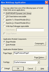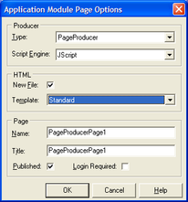 Група Application Module Options дозволяє набудувати параметри основного модуля прикладення. Параметр Page Name дозволяє вказати ім'я сторінки модуля (доступний лише для типу модуля Page Module). Параметр Caching дозволяє задати режим кешування прикладення. За умовчанням параметр має значення Cache Instance (дозволити кешування). Друге можливе значення - Destroy Instance відключає кешування. Залишимо даний параметр без зміни. Кнопка Page Options викликає діалог налагодження параметрів модуля прикладення (мал. 6). Група параметрів Producer дозволяє обрати тип продюсера сторінки (рядок введення Type) і скриптову мову (JScript або VBasic). Група HTML дозволяє вказати шаблон для генерації HTML-сторінки. Група Page дозволяє набудувати параметри сторінки: ім'я, заголовок, видимість (параметр published) і необхідність аутентифікації користувача для перегляду даної сторінки (параметр Login Required). Ім'я дублює параметр Page Name попереднього діалогу.