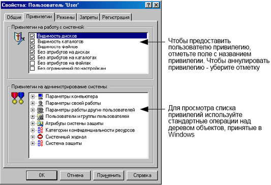 Привилегии на работу с системой - эти привилегии разрешают пользователю превышать свои права на доступ к ресурсам компьютера и игнорировать некоторые другие ограничения его работы в системе;