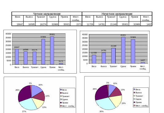 Составим диаграммы для получившейся таблицы. Сделаем активной какую-нибудь ячейку под таблицей. На панели инструментов стандартная нажмем кнопку мастер диаграмм. Выберем тип ГИСТОГРАММА, вид 1. Нажмем ДАЛЕЕ. Диапазон значений. Выделим значения от четного ввоза до четного местного сообщения в таблице 5. ДАЛЕЕ в закладке Подписи данных устанавливаем в подписях значений флажок напротив Значений. ГОТОВО. Удалим легенду. Для этого выделим надпись РЯД 1, вызовем контекстное меню и выберем ОЧИСТИТЬ. Выделим эту диаграмму, выберем пункт меню ДИАГРАММА – исходные данные. В закладке ряд найдем Подписи по оси Х, поставим туда курсор и введем диапазон заголовков столбцов таблицы №5 (выделив этот диапазон в таблице). Гистограмма готова.