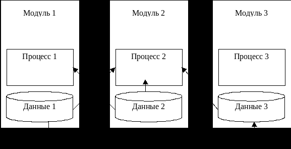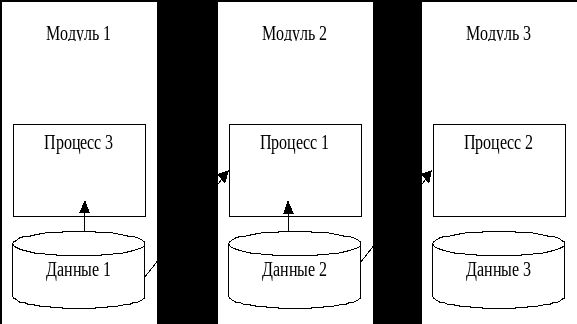 Если расположить процессы и данные с одинаковыми номерами в одном модуле, то получается 4 междумодульные связи