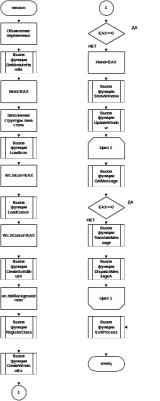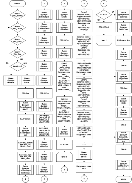 После главной функции следует процедура окна. Полученное сообщение сравнивается с сообщениями WM_DESTROY, WM_CREATE, WM_SIZE, WM_PAINT. В случае соответствия следует переход на соответствующую метку.