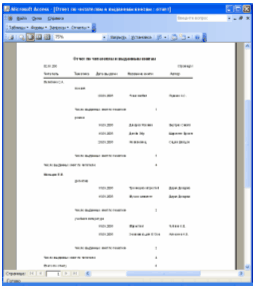 Создание четырех таблиц-справочников и основной таблицы. Создание базового, перекрестного, итогового запросов. Формирование форм. Формирование отчета по читателям и выданным книгам с итогами.