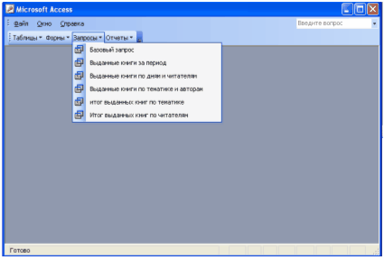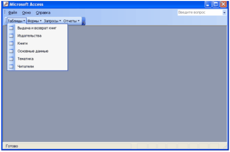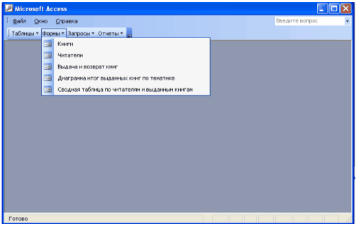Формирование меню из пунктов: таблицы, формы, запросы и отчеты для вызова разработанных таблиц, форм, запросов и отчетов.