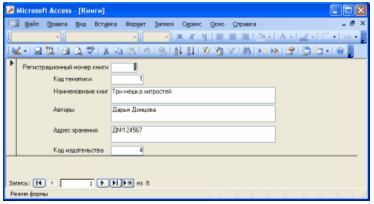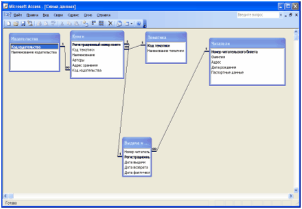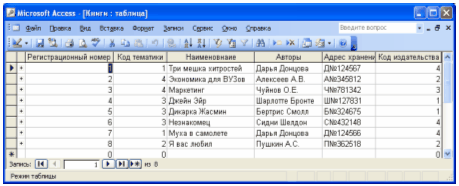Таблица «Книги» состоит из: регистрационного номера книги, кода тематики, наименования книги, авторов, адреса хранения, кода издательства.