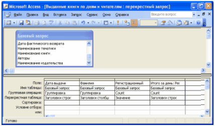 Рис. 4.9 Перекрестный запрос «Выданные книги по дням и читателям» при проектировании