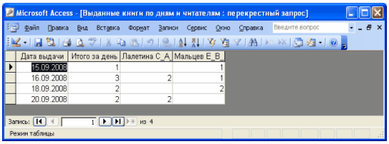 Рис. 4.10 Перекрестный запрос «Выданные книги по дням и читателям» при выполнении