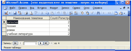 Рис. 4.4 Итоговый запрос «Итог выданных книг по тематике» при выполнении