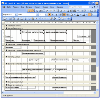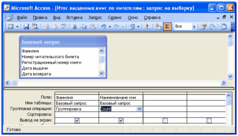 Рис. 4.5 Итоговый запрос «Итог выданных книг по читателям» при проектировании