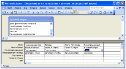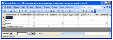 Рис. 4.8 Перекрестный запрос «Выданные книги по тематике и авторам» при выполнении