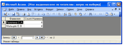 Рис. 4.6 Итоговый запрос «Итог выданных книг по читателям» при выполнении