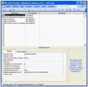 Рис. 2.9 Таблица «Выдача и возврат книг» при проектировании