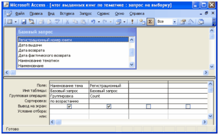 Рис. 4.3 Итоговый запрос «Итог выданных книг по тематике» при проектировании