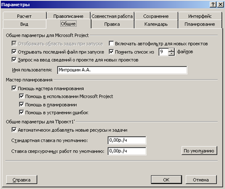 Закладка Общие (General) (рисунок 3) состоит из трех разделов. В разделе Общие параметры для Microsoft Project (Genera option for Microsoft Office Project) расположены элементы настройки общих параметров программы, в третьем Общие параметры для…(General options for…) – элементы настройки общих параметров открытого проекта. В разделе Мастер планирования (Planning Wizard) определяется, каким образом будут отображаться подсказки при составлении плана проекта.