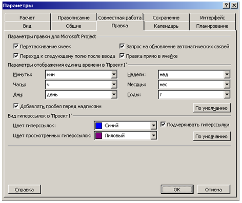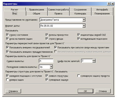 Перед началом работы MS Project необходимо настроить некоторые параметры программы. Для перехода к настройке нужно выбрать команду Сервис → Параметры (Tools → Options). На экране появится диалоговое окно настроек с несколькими закладками, на которых сгруппированы параметры, определяющие работу программы. Почти на каждой закладке есть кнопка По умолчанию (Set as default), позволяющая сохранить сделанные настройки так, чтобы они автоматически применялись во всех последующих проектах.