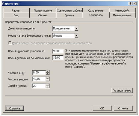 Изменение параметров данного диалогового окна не влияет ни на календарь проекта, ни на календари рабочего времени ресурсов. Оно влияет только на преобразование длительностей в соответствующие временные интервалы. Заданный на этой вкладке временной интервал применяется также к преобразованию длительности в значения трудозатрат. Подобным же образом осуществляется преобразование временных значений полей Часов в неделе и Дней в месяце.