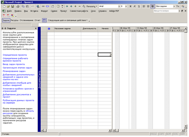 Среди панелей инструментов есть особая панель Консультант (Project Guide), которая расположена над рабочей областью программы. Названия кнопок этой панели соответствуют основным объектам, с которыми может работать MS Project: Задачи (Tasks), Ресурсы (Resources), Отслеживание (Track), Отчет (Report). При щелчке по любой из этих кнопок на панели в левой части рабочей области, которая называется Областью задач (Task Pane) отображается список возможных действий с выбранным объектом.