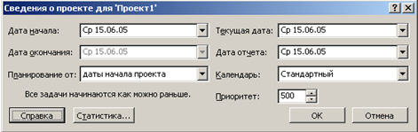Чтобы составить расписание (план) работ в MS Project нужно создать файл нового проекта, щелкну по кнопке Создать (New) на панели инструментов. Если установлен соответствующий флажок в настройках программы, то откроется диалоговое окно Сведения о проекте (Project Information) (рисунок 7). Чтобы изменить параметры проекта в дальнейшем, это диалоговое окно можно вызвать командой Проект→ Сведения о проекте(Project→Project Information).