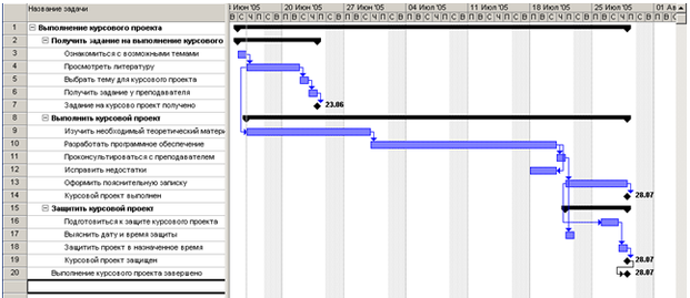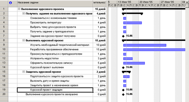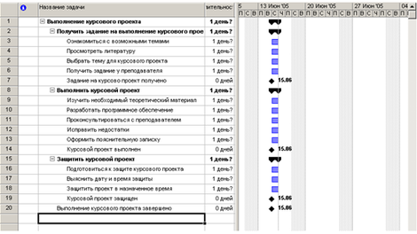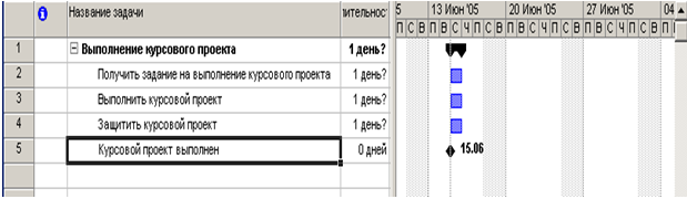 Результаты фаз вводятся в виде завершающих задач, и эти задачи могут не обозначать реальной деятельности. Например, результатом фазы «Выполнение курсового проекта» является сданный курсовой проект. Для того, чтобы указать тот факт, что данная задача является завершающей, ее длительность устанавливается равной 0 (рисунок 9).