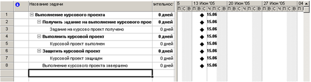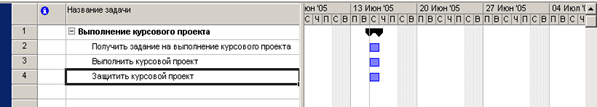 Добавим теперь завершающие работы к фазам «Получить задание на выполнение курсового проекта», «Выполнить курсовой проект», «Защитить курсовой проект». Сейчас это не фазы, но они станут фазами, если к этим работам добавить подчиненные работы (рисунок 10).